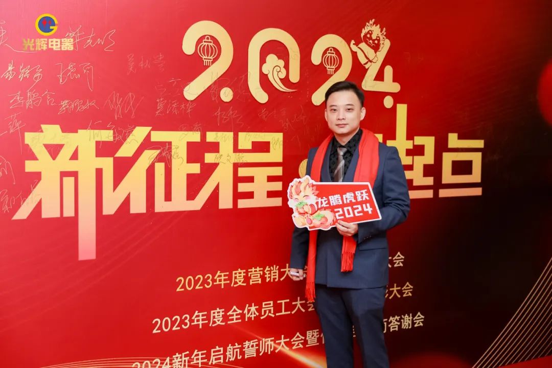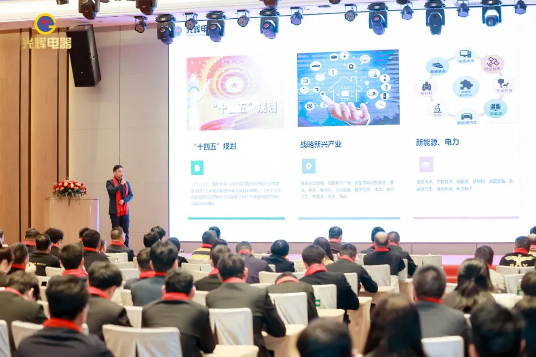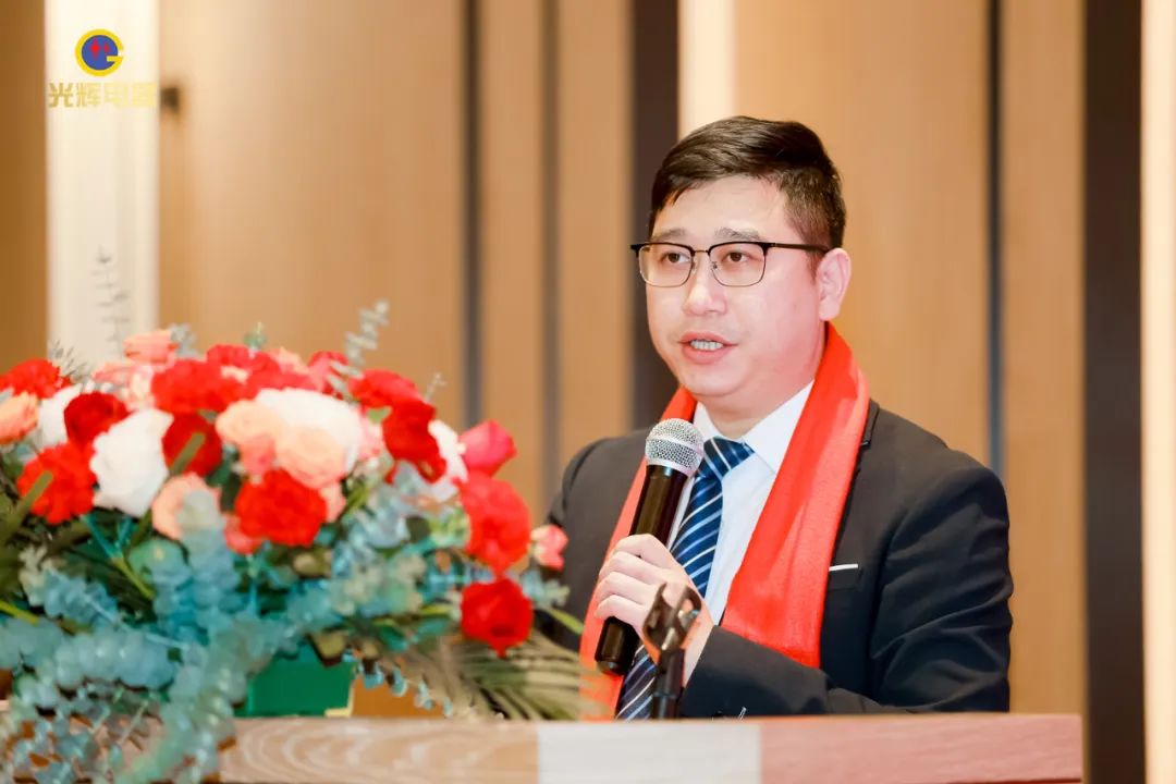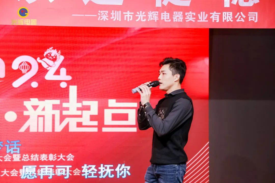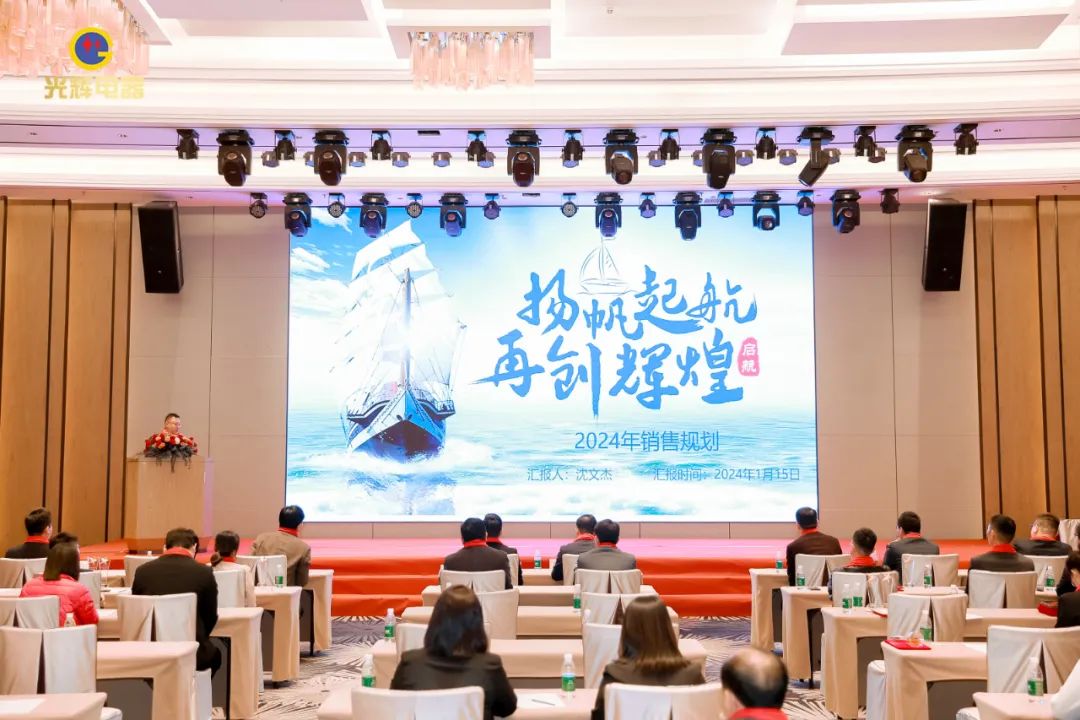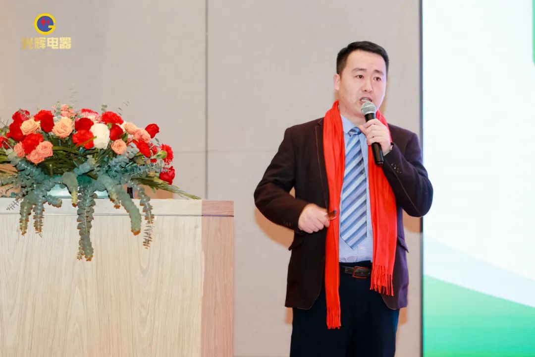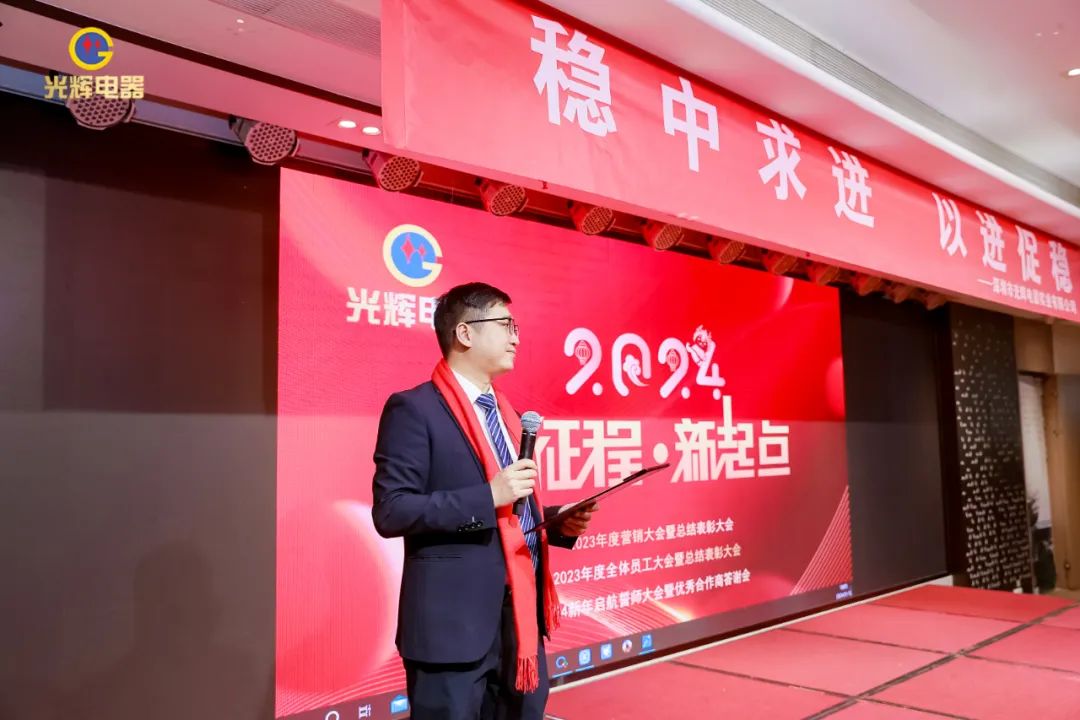 年会伊始,光辉公司董事长蔡宗光发表激情演讲;行董事兼总经理孙伟作2024年规划;常务副总贺未作2023年工作总结;他掷地有声地向大家描绘了2024年全新蓝图;营销中心总经理沈文杰作2024年营销中心工作部署。